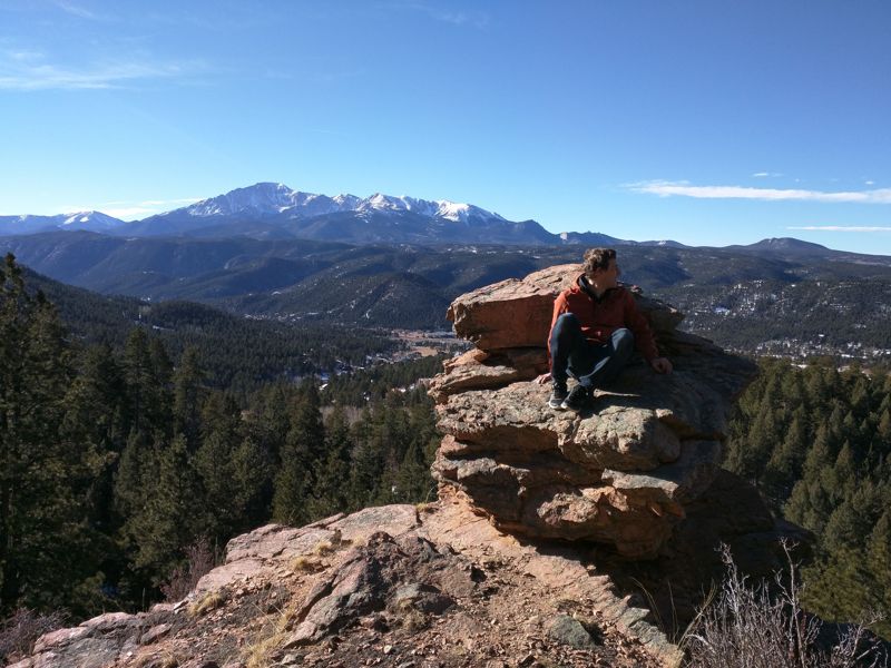 We found a cozy spot to park that night. It was located, unbeknownst to us, beside some incredible hiking trails. We woke up and went for a hour long hike through trails in Woodland Park. Literally scrambling up the side of a fairly steep hill, we reached the top of a rock lookout with one heck of a view.